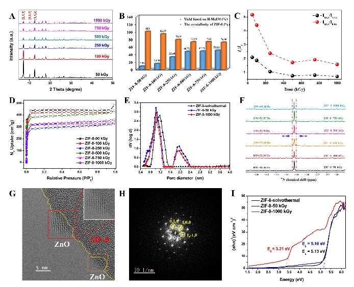 图2 辐射合成路径与溶剂热合成路径的能线图及不同吸收剂量下合成材料的化学结构、结晶性和比表面积表征