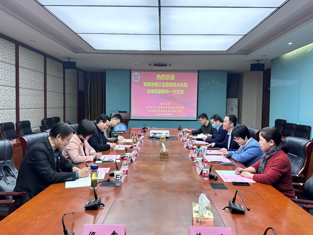 3月9日,安徽省核工业勘查技术总院(安徽省放射核素工程研究中心)史春旺副院长一行来访国重室。放射医学与辐射防护国家重点实验室副主任华道本,放射性药物创新与转化中心主任助理第五娟,分子影像与核医学研究中心副主任李桢、副教授王广林,国重室综合办主任徐加英参加了调研交流。会议由华道本主持。