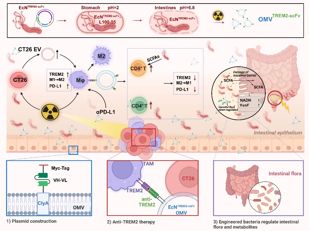 细菌介导的抗肿瘤治疗因其天然靶向性和免疫激活特性备受关注。其中,大肠杆菌Nissle 1917(EcN)作为一种益生菌,凭借其安全性及高效的蛋白表达能力成为理想的药物递送载体。然而传统的细菌递送系统存在靶向性不足和药物释放可控性差的技术瓶颈。本研究创新性地利用细菌的SOS响应系统,构建电离辐射响应型工程菌(EcNTREM2-scFv),通过工程菌外囊泡递送抗TREM2单链抗体,精准清除TREM2+ TAMs,逆转肿瘤免疫抑制微环境。这一策略不仅克服了传统放疗对TME的负面调控,还通过联合免疫检查点抑制剂增强CD8+ T细胞活性,为低位直肠癌的放射免疫治疗提供了新思路。此外,口服表面修饰的工程菌可以进一步调节肠道菌群及其代谢从而增强对低位直肠癌的治疗效果。因此,我们构建的基于工程菌的辐射响应性药物递送系统不仅为低位直肠癌的治疗带来了新的希望,而且展示了在复杂的肿瘤微环境中调节免疫反应的潜力,为肿瘤的放射免疫治疗开辟了道路。