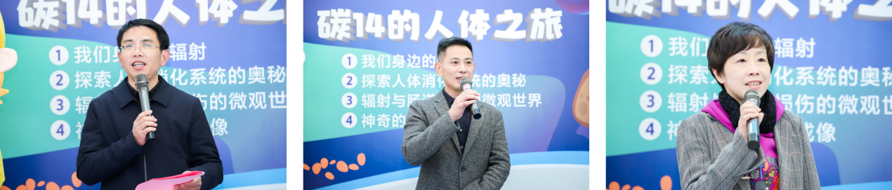 王成奎书记在致辞中首先对参加本次开放日活动的小朋友和家长们表示欢迎。他谈到,苏州大学放射医学是国家重点学科,国重室也是该领域唯一的国家重点实验室,我们有责任做好核科学和放射医学相关知识的公众科普工作,做到科技创新和科普宣传两不误。希望小朋友们通过参加此次学有所获。包焕正主任表示,兴趣是最好的老师,希望孩子们都能发展自己的兴趣爱好;同时家长也应注重孩子的科学启蒙,培养他们的科学精神和探究精神。汤蕾社长对国重室精心组织本次开放日活动表示感谢,并为在寒冷初冬仍积极参加活动的家长和小朋友们而感动,她鼓励“大朋友”和小朋友们都能用探索的眼睛去发现科学的美。