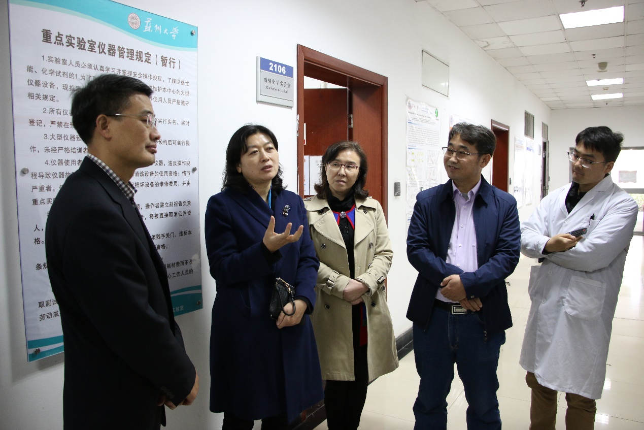 王成奎从国重室的科普基地建设、开展的各类科普活动、下一步的科普工作计划等方面进行了详细汇报。在听取汇报后,钱岩副部长来到国重室放射性实验室、环境放射化学中心和分子影像与核医学研究中心与科研人员交流。了解国重室开展科普所依托的各领域相关的科研成果,在调研中还询问了国重室科普活动开展中遇到和问题和困难。