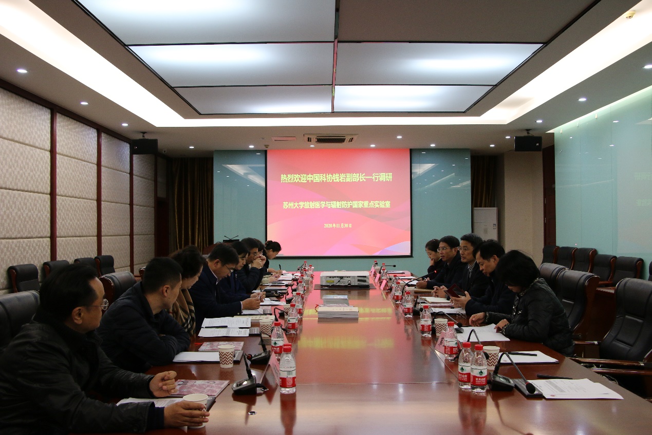 11月30日下午,中国科协科普部钱岩副部长率《全民科学素质行动计划纲要》调研组一行莅临国重室,就科普工作开展专题调研。中国科协科普部联络处处长包晗、江苏省科协科普部部长、全民科学素质工作办公室主任严道明、苏州市科协主席程波等参加调研,苏州大学党委副书记邓敏陪同调研。苏州大学科学技术研究部部长郁秋亚,综合办主任刘海燕,医学部放射医学与防护学院党委书记王成奎,国重室综合办主任徐加英,国重室相关教师和科普骨干参加调研座谈会。