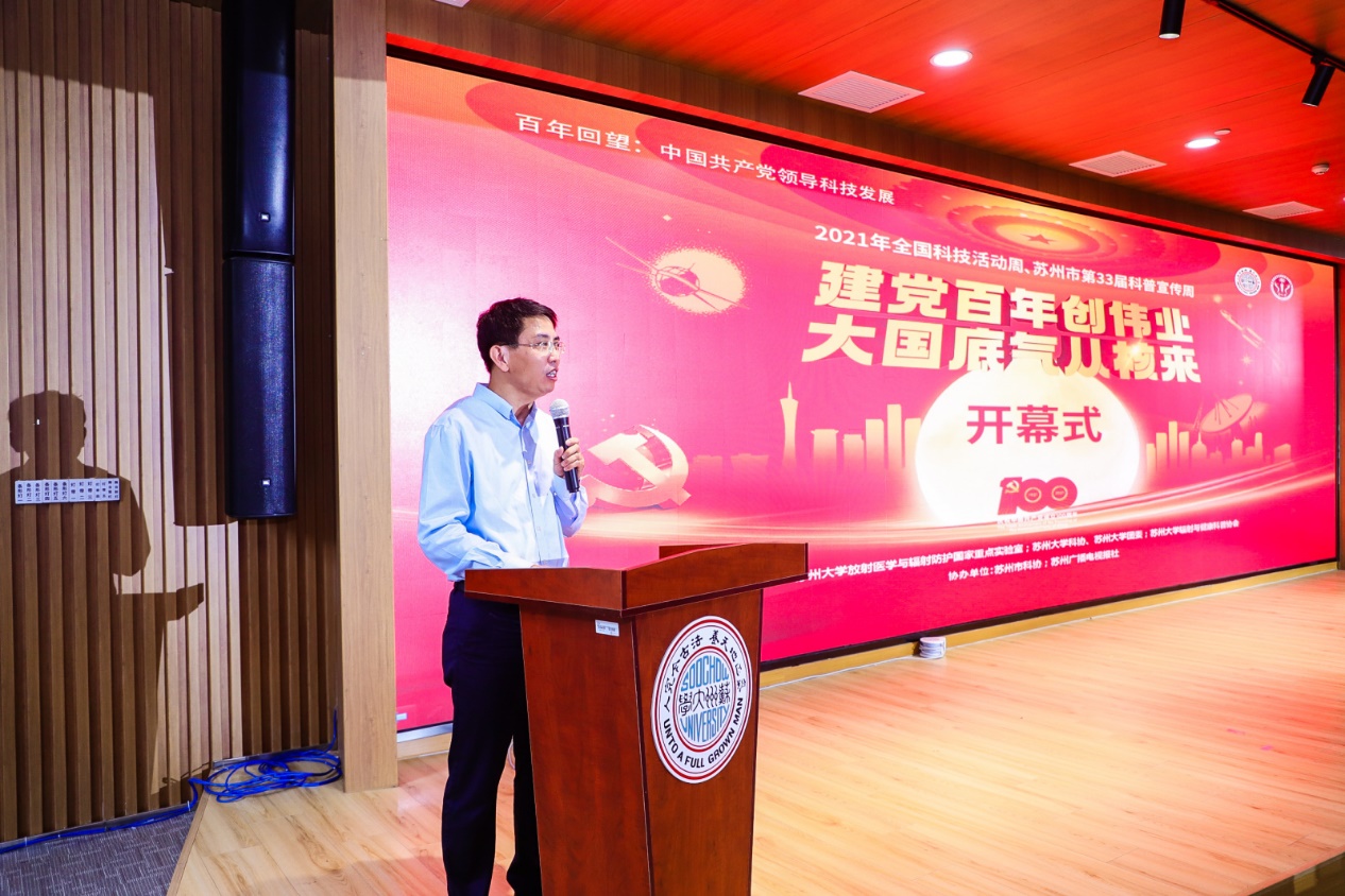 在第五个“全国科技工作者日”到来之际,由苏州大学放射医学与辐射防护国家重点实验室、苏州大学科协、苏州大学团委、苏州大学放射医学与辐射防护科普协会共同主办,苏州市科协、苏州广播电视报社协办的“2021年全国科技活动周暨国家重点实验室开放日活动”开幕式于5月30日上午在苏州大学独墅湖校区举行。江苏省科协科普部三级调研员范正银,苏州市科协科普部部长吴英宁,苏州市科协广播电视报记者金小花,太仓市科协普及部部长黄乐,苏州大学国际合作交流处处长、放射医学与防护学院副院长王殳凹,学院党委书记王成奎,放射医学与辐射防护国家重点实验室副主任华道本等领导出席活动。放医学院党支部师生和本科生等参加活动。开幕式由王成奎主持。