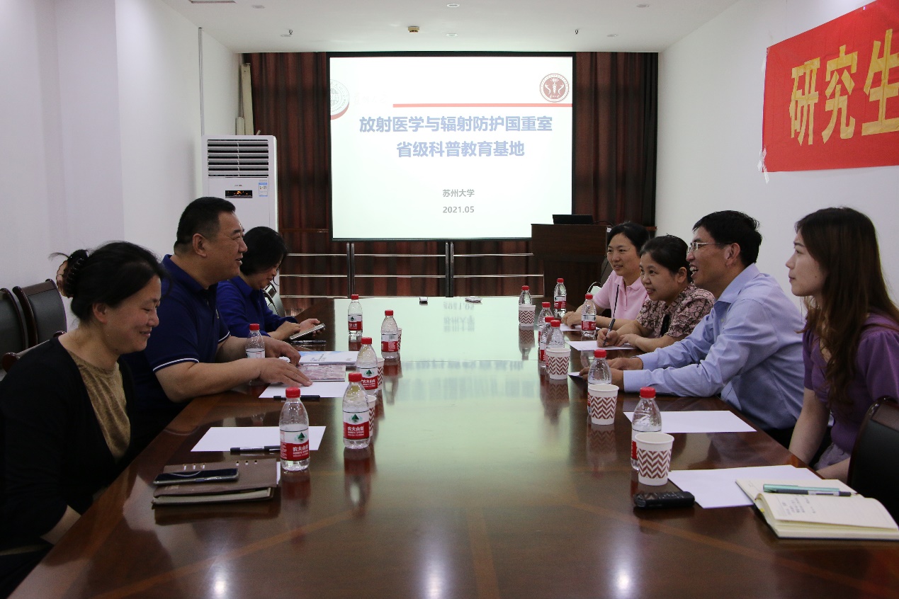 5月31日下午,苏州市科学技术协会副主席张志军、市科协普及工作部部长吴英宁一行来国重室调研科普工作。苏州大学科学技术研究部综合办公室主任、苏大科协副秘书长刘海燕,放射医学与防护学院党委书记王成奎,放射医学与辐射防护国家重点实验室综合办公室主任徐加英陪同调研。