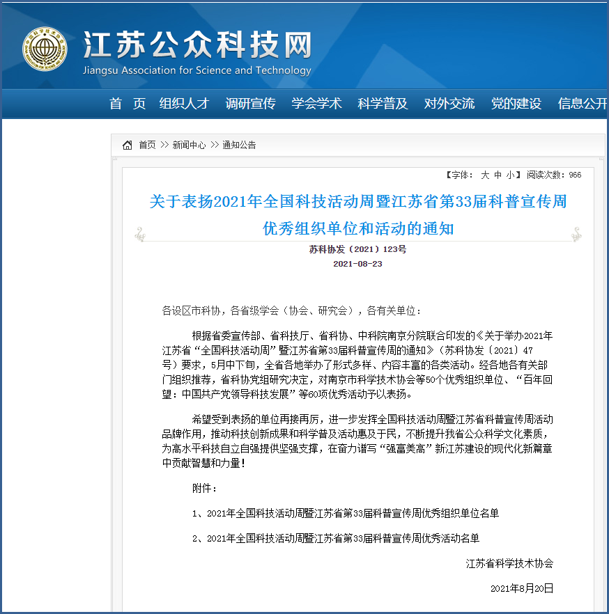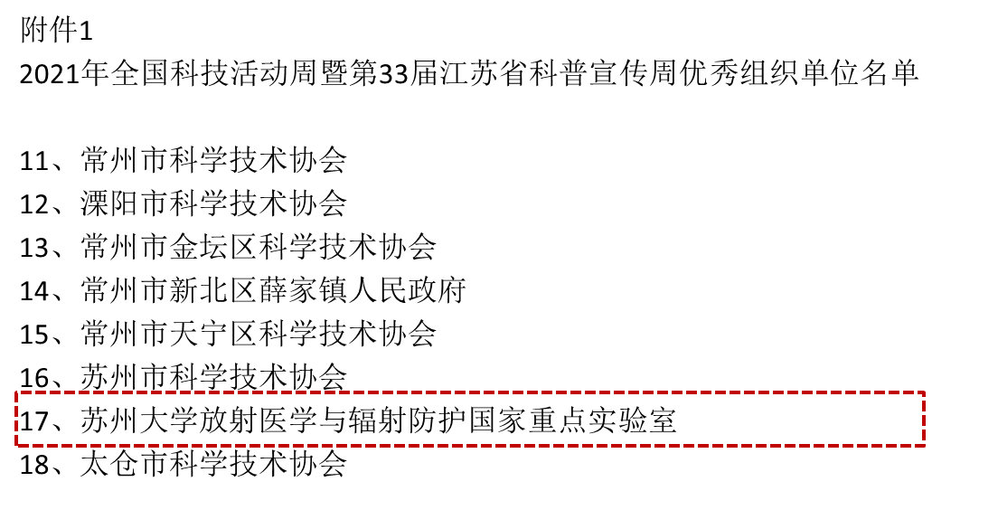 近日,江苏省科学技术协会发布了“关于表扬2021年全国科技活动周暨江苏省第33届科普宣传周优秀组织单位和活动的通知”,苏州大学放射医学与辐射防护国家重点实验室荣获“2021年全国科技活动周暨第33届江苏省科普宣传周优秀组织单位”荣誉称号。