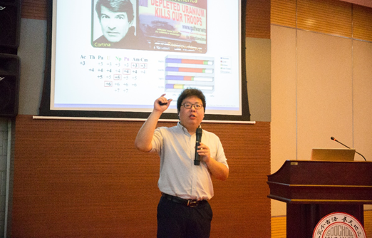 王殳凹杰青以“顶天立地—勇攀科研新高峰”为题。从放射化学学科的发展历史入手,向大家讲述了放射化学的发展以及全球核能源的发展趋势,与大家分享了自己的亲身经历及最新研究成果。作为中国化学会“青年化学家元素周期表”中“钚”和“铀”元素的代言人,他勉励大家积极加入放射化学学科领域,为我国的核科学事业做出应有的贡献,并引用了周恩来总理的话“中华之崛起而读书”。