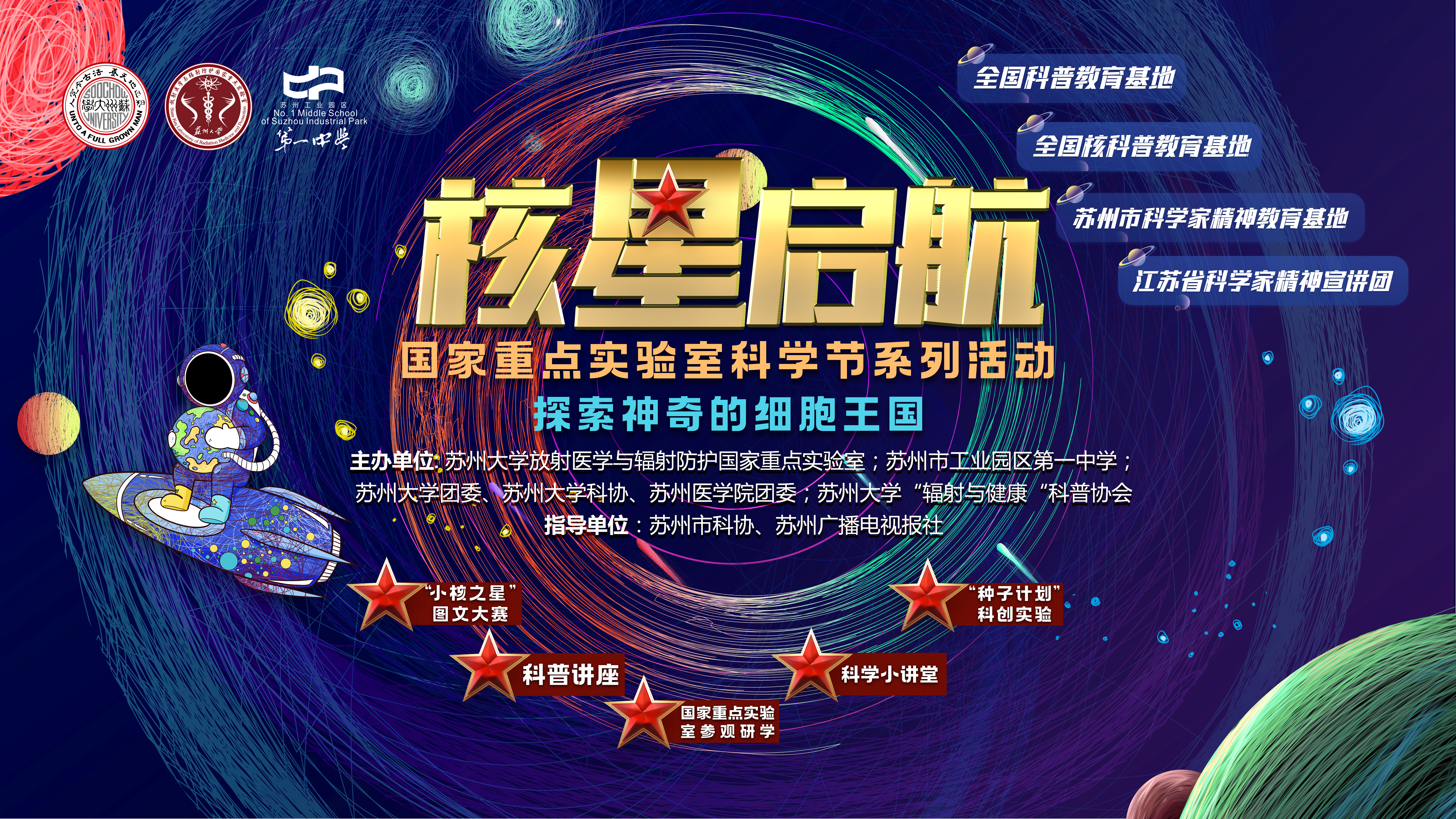 本次科技节活动是放射医学与辐射防护国家重点实验室全国科普教育基地面向中学生进行的分层、深度科普的一次创新性探索与尝试。活动前期,通过与园区一中一线教师深入的沟通和交流,收集同学们课程中的难点、兴趣点等话题,结合学校需求,利用国重室资源,量身定制的特色“科学节”方案。活动从科普讲座、科技竞赛、科创实验、翻转小讲堂等多层次、多维度展开,内容将涉及细胞生物学、分子生物学、核辐射物理学、放射医学、放射化学等多学科,将其有机融合,旨在以学生为中心,从问题来源的教学为主导,立足教材,开拓青少年科学视野,让同学们感受科学的无穷乐趣,揭开核科学及放射医学的神秘面纱。