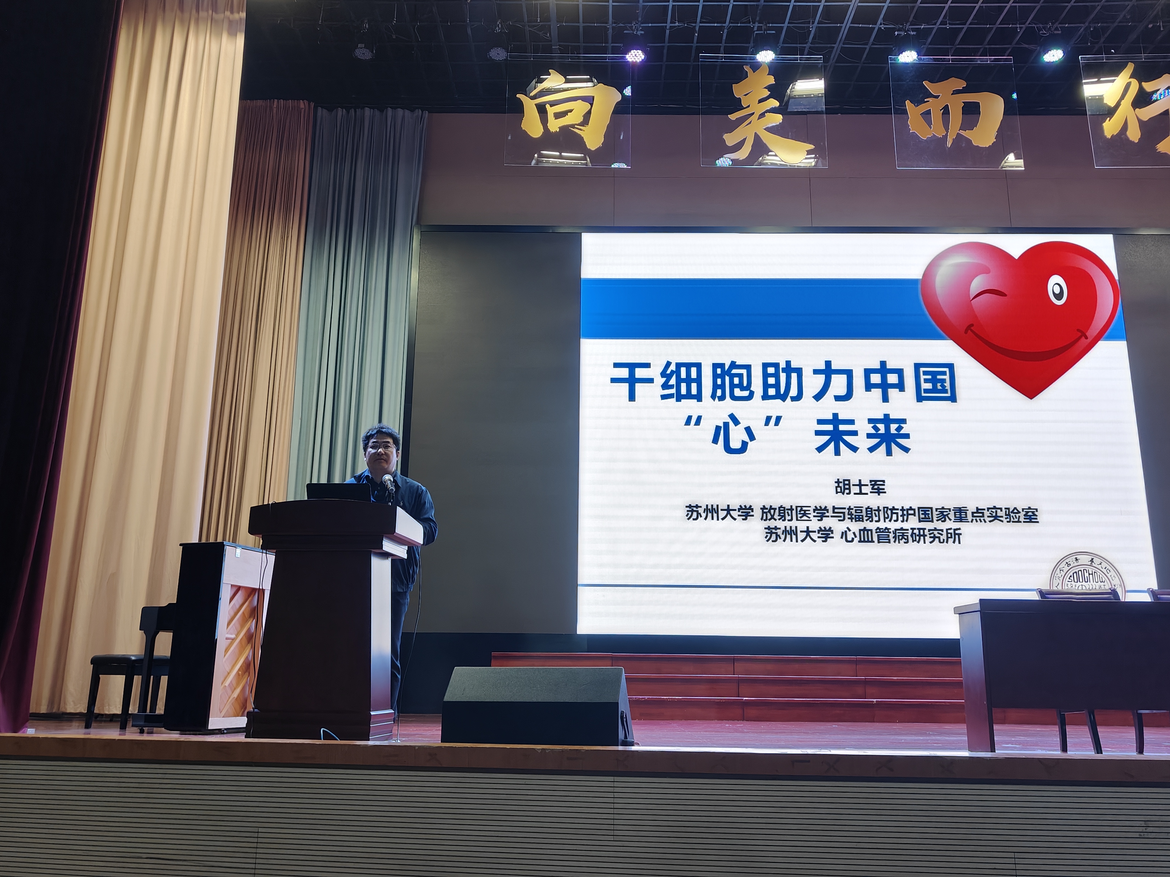 随后,胡士军教授给同学们带来题为“干细胞助力中国“心”未来”的精彩报告。胡教授结合心脏的结构、干细胞诱导心脏类器官的前沿研究、太空环境对人体心血管系统的影响等方面的有趣知识,深入浅出的普及了心血管疾病的发病机制以及新型细胞治疗手段,开阔了同学们视野,并呼吁大家脚踏实地、仰望星空、探索宇宙,为人类科技的进步不懈奋斗!