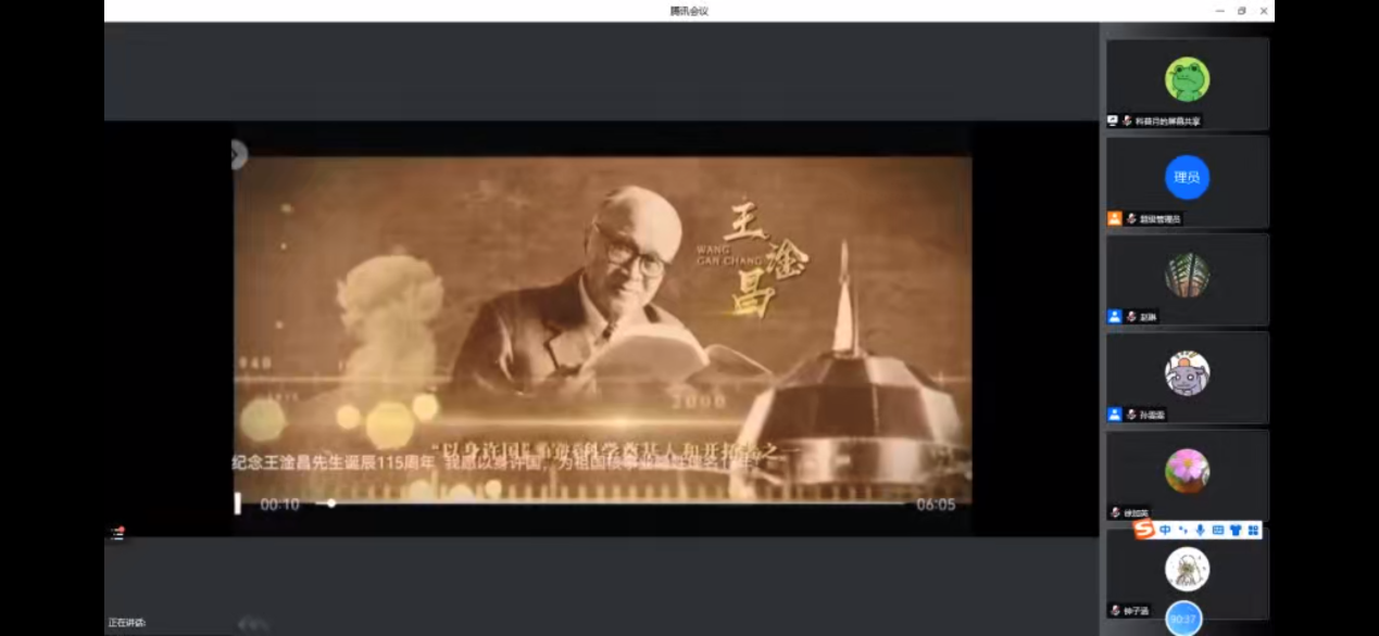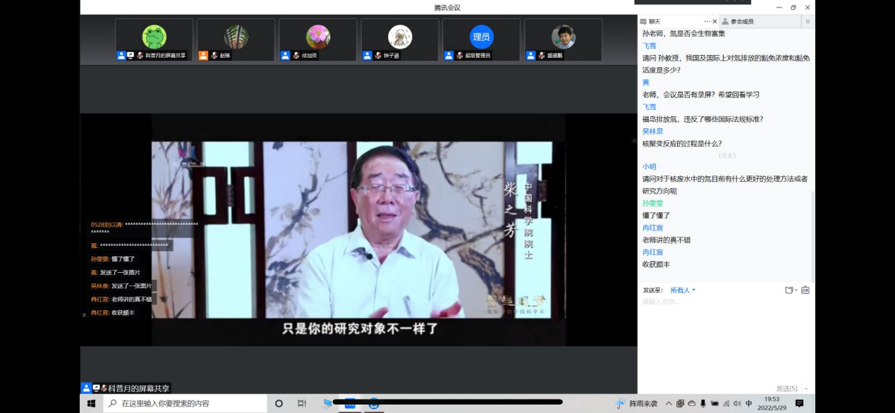 第二场讲座中,王殳凹教授介绍了讲座相关背景:核能和核技术是一把双刃剑,既能为人类提供取之不尽用之不竭的清洁能源也具有一定的负面效应,比如同时如何处理不当的放射性废物也是技术创新的挑战,因此等会威胁消除放射性废料对人类健康的威胁也成为科技工作者的重要目标。在第二天的讲座中,孙亮老师通过《氚的基本性质和环境迁移特点》为大家深入浅出的讲解了氚对环境健康影响的重要性和现实紧迫性。如何趋利避害,那就要对氚的理化性质及其环境迁移规律有所了解。接着,崔凤梅老师在《氚的毒理知多少》中进一步为大家展开了氚的毒性分级、生物转运、损伤效应以及安全防护等相关知识。力求全方位多角度让大家对氚这个关键核素有所了解。讲座过程中,播放了《繁星追梦》柴之芳院士专题短片,柴院士以自己的经历勉励青少年“科学的乐趣”就是在不断的学习不断的获取新知识,使人处于一种不断提升的状态。