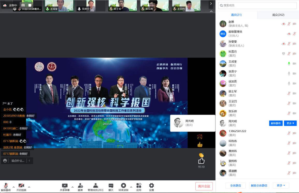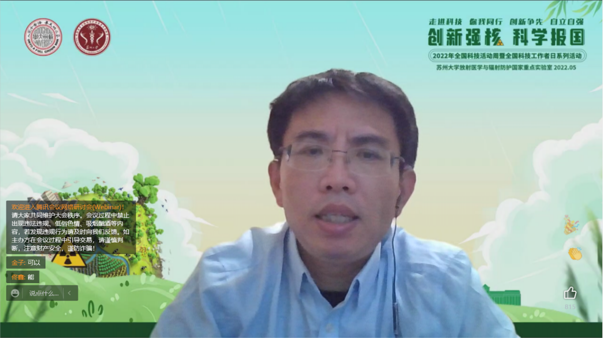 5月30日是第6个全国科技工作者日,放射医学与辐射防护国家重点实验室积极响应中国科协和科技部的相关号召,联合苏州市科协、苏州大学科协以及苏州广播电视报社等相关单位,于5月28日、29日举办了“创新强核 科学报国——2022年全国科技活动周暨全国科技工作者日系列活动‘与核同行’科普大家谈”线上讲座活动。苏州市科协科普部部长吴英宁部长、苏州大学科学技术研究院常务副院长、苏州医学院党工委书记、校科协秘书长钱福良秘书长出席本次活动开幕式并致辞,我院副院长国家杰青王殳凹教授、国际宇航科学院院士周光明教授作为特邀嘉宾参与主持讲座活动,本次活动由放射医学与防护学院党委书记王成奎主持。活动开始前,展播了国重室科技成果展、国重室科普工作回顾、未来核能展望等系列宣传片。