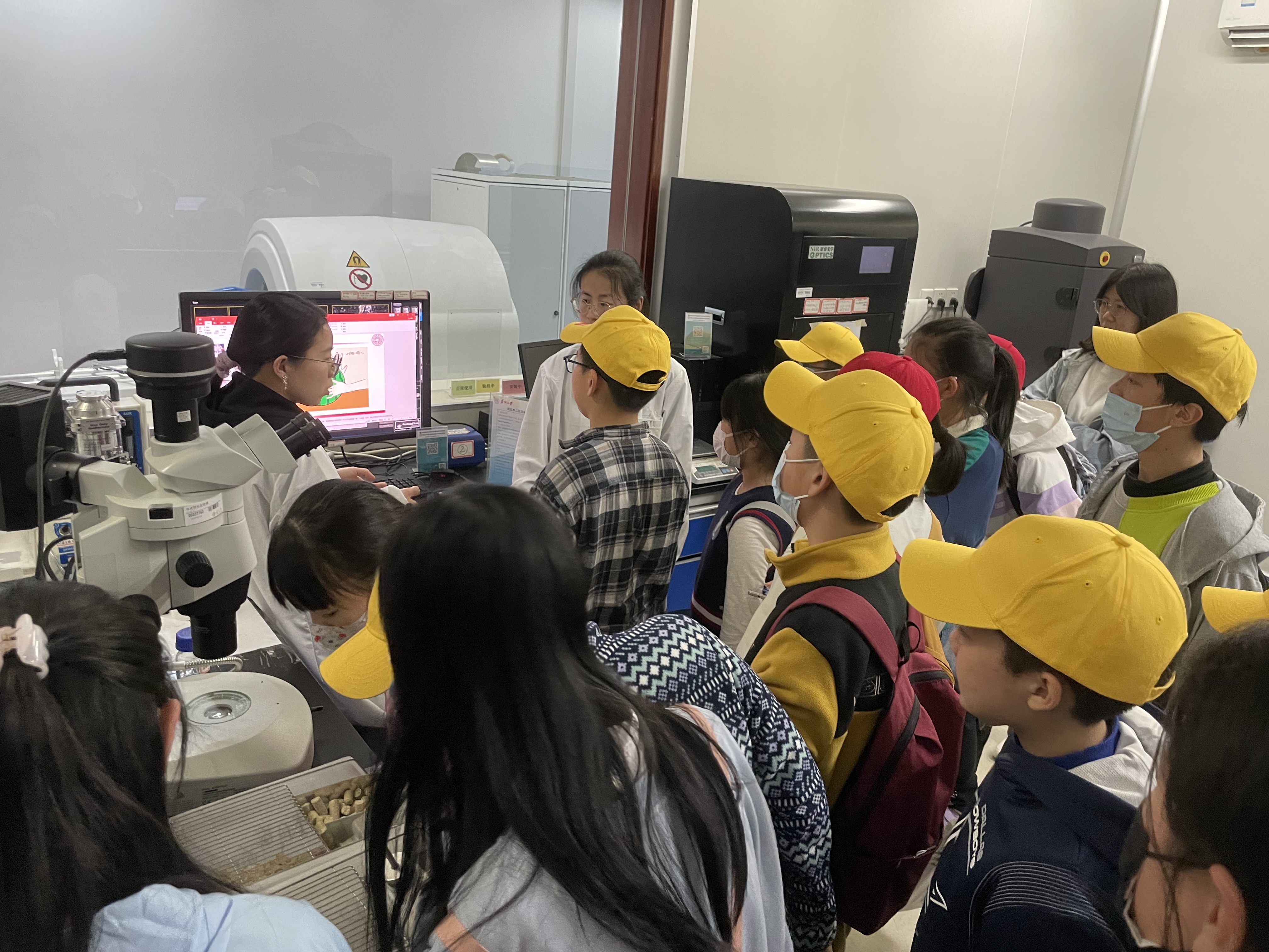 随后,活动分为三组,交叉参观了“两弹一星”精神及科学家精神展、核技术医学应用主题展、生命伦理馆、国重各中心实验室,感受科技创新前沿。段广新老师与鲁杰同学声情并茂地介绍了我国核工业发展历程,以及“两弹一星”科学家们背后的故事与精神,以及核技术在医学上的广泛应用。在生命伦理展馆,马彬老师用器官模型为孩子们细致的科普了消化器官的功能结构,刘雨桐同学为孩子们用漫画ppt的方式讲解了消化系统的组成和消化的过程。在国重实验室,盛道鹏老师介绍了核废物处理的相关前沿研究,刘胜堂老师带领同学们参观了大型计算机集群,李藏同学介绍了分子影像相关的知识。同学们纷纷感慨,神奇的核技术领域真的蕴含着无穷的奥秘,等着大家去探索!