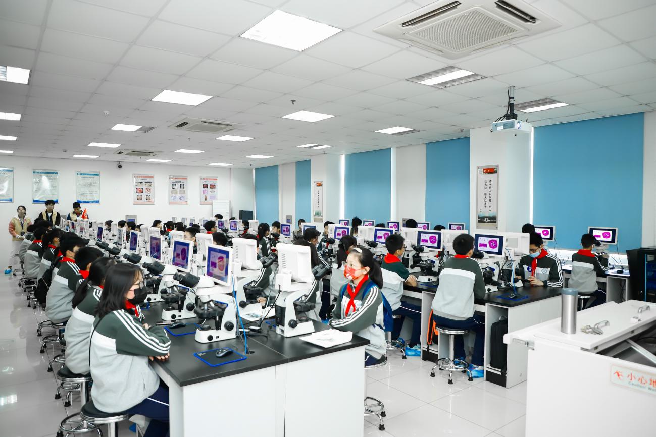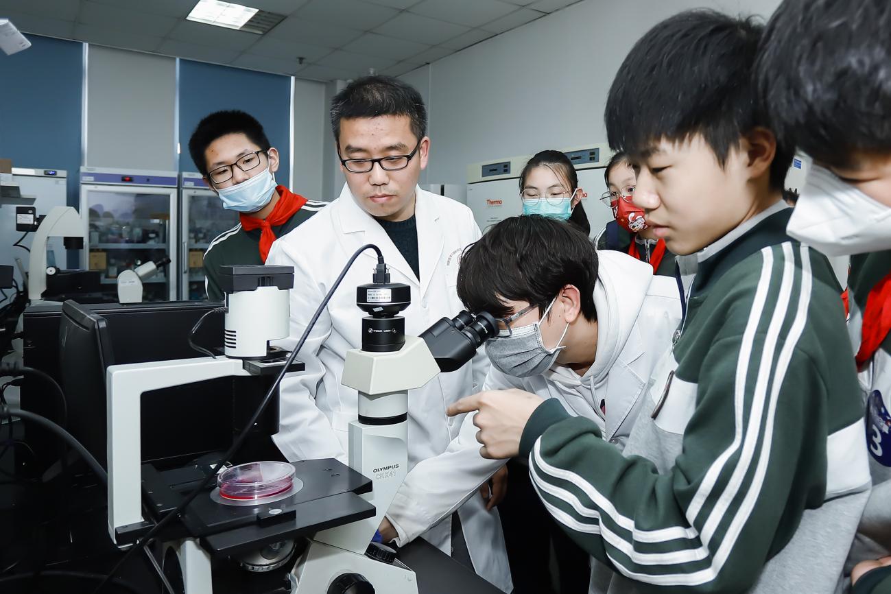 接着,同学们分为4组,在志愿者的带领下,分别参观了“两弹一星”精神及科学家精神展和核技术医学应用主题展、人体生命奥秘馆,并走进实验室解密国重室显微镜。段广新老师与鲁杰同学声情并茂地介绍了我国核工业发展历程,以及“两弹一星”科学家们背后的故事与精神,以及核技术在医学上的广泛应用,让大家认识了我国核技术的起源及发展。在人体生命奥秘馆,在马彬老师和刘雨桐同学的讲解下,同学们一起探寻了人体的消化系统。在国重实验室,通过倒置显微镜、荧光显微镜、激光共聚焦显微镜、原子力显微镜等的参观和研学,同学们与吴安庆老师和崇羽老师一起解密了微观世界中的细胞,沉浸式的感受并体验了前沿的科研装置和设备,激发了大家的科学兴趣。