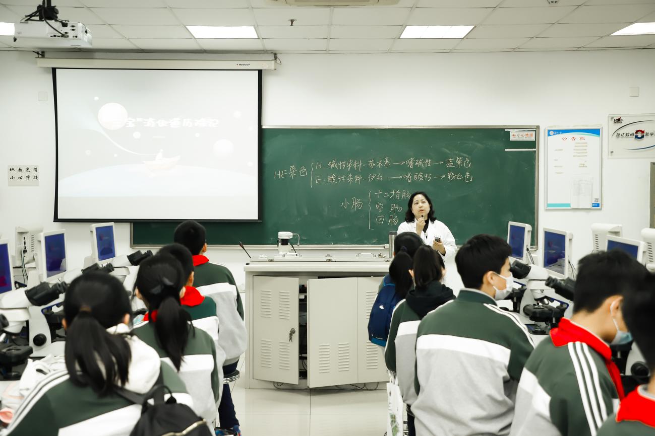 随后,同学们首先跟随志愿者来到数据互动实验室,来自基础医学与生命科学学院的傅奕老师给大家作了题为“‘三宝’消化道历险记”的互动小课堂,课堂上,配合电子显微镜的观摩,傅老师生动的讲解使同学们对消化系统的组成、食物中三大营养物质的吸收和代谢有了更深刻的了解,同时大家也还认识到了消化道中各种各样重要的细胞和它们行使的功能,同学们听得津津有味,一起走进了人体消化道奇妙的微观世界。