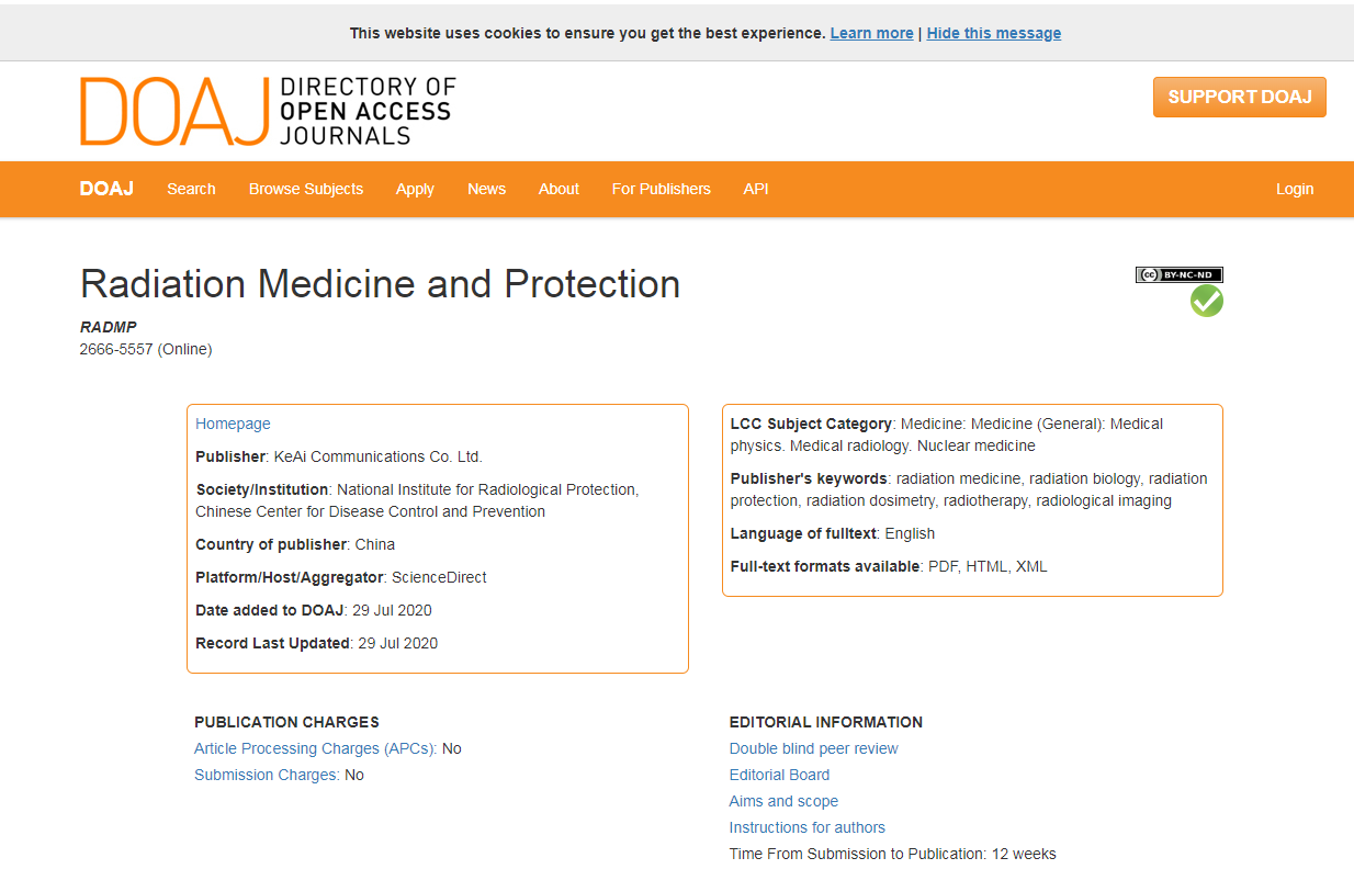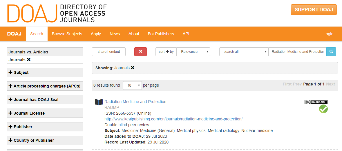 苏州大学放射医学与辐射防护国家重点实验室、中国疾病预防控制中心辐射防护与核安全医学所共同主办的“Radiation Medicine and Protection”英文刊 通过全球最具影响力的开放存取期刊目录( Directory of Open Access Journals ,DOAJ)评估后,于2020年7月29日被DOAJ数据库正式收录。(查询地址:https://doaj.org/)
