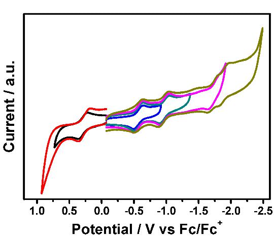 随后通过循环伏安法对UCN@Cs(6)-C82进一步表征。其第二还原电位和第三还原电位之间的差值远大于第一/第二和第三/第四还原电位的差值,该特征表明其团簇和碳笼之间存在两电子转移,电子结构为[U3+(CN)-]2+@[Cs(6)-C82]2-,U表现出+3价的氧化态。同时其较小的电化学带隙表UCN@Cs(6)-C82可能是开壳层结构。
