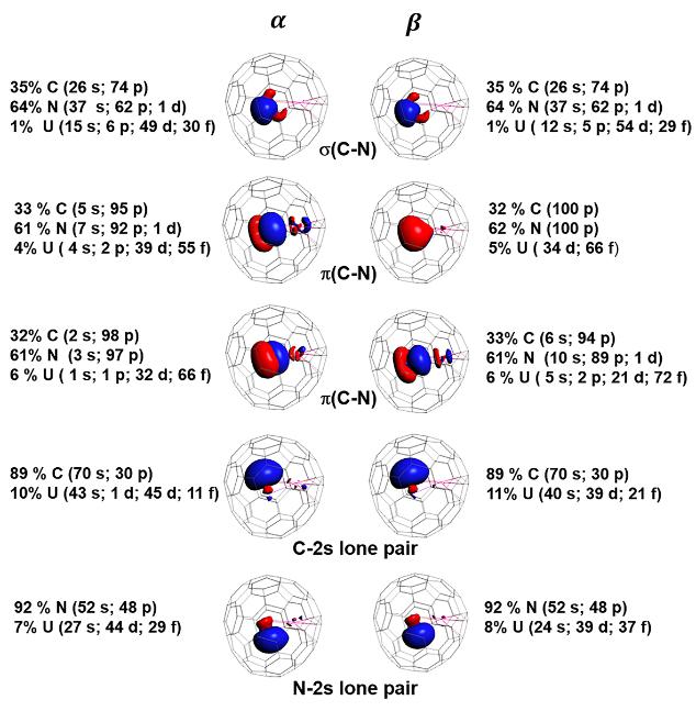 理论计算结果表明UCN@Cs(6)-C82是开壳层的结构,基态是自旋四重态。在自旋四重态下优化得到了UCN@Cs(6)-C82的结构参数,其键长键角和实验数据相吻合。团簇向碳笼转移两个电子,因此U呈现+3价的氧化态,U(5f3)。U的Mullikin自旋布局是约为2.5-2.6个未成对电子。但基于NBO计算结果显示,U的自然电荷为1.1,其电子结构为[core]7s(0.22)5f(3.46)6d(0.81),表明碳笼和CN配体存在明显的向U的电子“捐献”。这一电子结构使得分子体系中的UCN团簇实际接近于中性,其中 U也可以理解为+1价,呈现出罕见的价态模糊性。