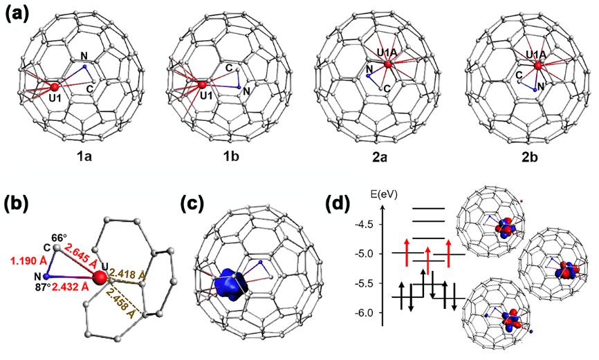该团簇中U-N键和U-C键键长分别为2.302 Å和2.520 Å,均处于单键键长范围内,而C-N键长则为1.210 Å。略长于C≡N叁键键长,该现象与先前镧系金属内嵌氰化物团簇富勒烯MCN@Cs(6)-C82 (M = Dy, Tb and Y)中观测到的CN-配体中C≡N三键被压缩的现象相反。UCN团簇中U-C-N键角为65°,U-N-C键角则为85°,接近一个直角,形成了一个独特的ƞ2配位的三角形构型的UCN团簇。
