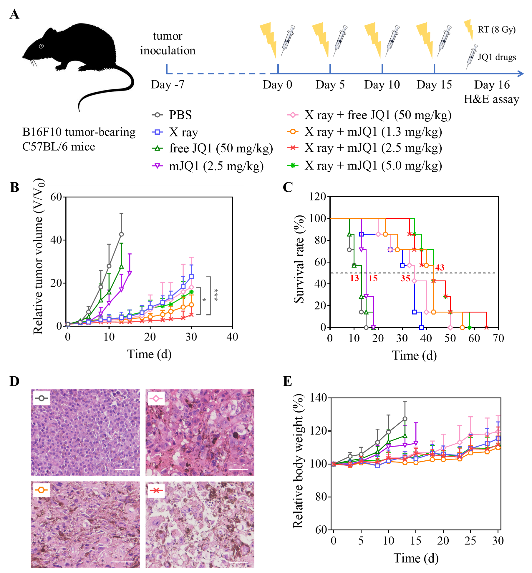 mJQ1是用聚乙二醇-b-聚(L-酪氨酸)共聚物(PEG-b-PTyr)构建得到,其一方面可通过π-π堆积作用和疏水作用高效包载JQ1,另一方面在酶存在的环境中会被降解从而快速释放被包载药物。细胞实验显示mJQ1能选择性抑制B16F10肿瘤细胞中c-MYC和PD-L1的表达,从而促使细胞凋亡并阻滞细胞周期进展,以及调节TME并激活机体抗肿瘤免疫反应。在荷B16F10肿瘤的C57BL/6小鼠中,低剂量的mJQ1(2.5 mg JQ1 equiv./kg)通过瘤内给药后显示出了比高剂量经腹腔注射的自由药(50 mg JQ1 equiv./kg)更好的抑瘤效果(图2)。进一步结合RT后,mJQ1能显著提升B16F10黑色素瘤中CD8+ T细胞含量以及CD8+ T/调节性T细胞(Treg)的比率,从而激发局部和全身抗肿瘤免疫能力,实现了对原发瘤和远端肿瘤的显著抑制并延长荷瘤小鼠的存活时间。该多功能胶束药物mJQ1具有较强的抑瘤功效,可望用于多种恶性肿瘤的免疫治疗。