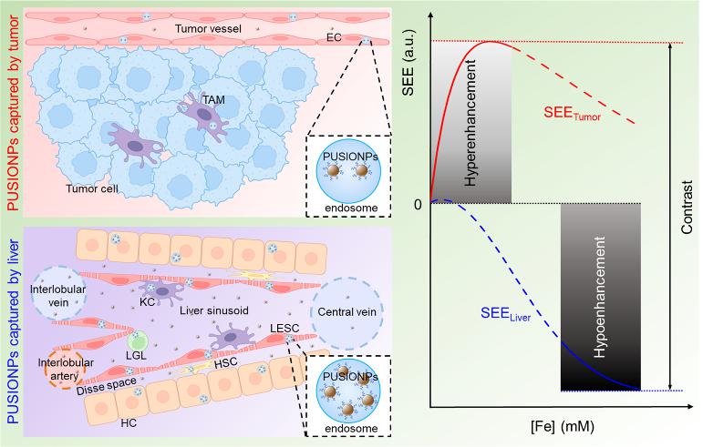 该研究分别从器官、组织、细胞和亚细胞水平,系统研究了PUSIONP的肿瘤-肝脏分布,揭示了PUSIONP非聚集形式的富集于各种细胞内体中。研究表明,PUSIONP在细胞内化后,主要被隔离在核内体中。肝实质和肿瘤细胞的不同摄取水平导致了不同的富集水平,造成肿瘤高信号和肝脏低信号,从而形成了极高的对比。结合体外实验和理论模拟,该研究还详细揭示了纳米氧化铁弛豫特性对局部PUSIONP浓度的依赖性,揭示了肝脏和肿瘤细胞内体中不同纳米氧化铁的富集程度对肿瘤-肝脏对比度和肿瘤边界清晰度的关键作用。具体来说,PUSIONP一旦被捕获到细胞内体中,就表现出显著的浓度依赖性横向弛豫。因此,由于大部分肝细胞参与了PUSIONP的内吞,因此肝实质捕获的PUSIONP很容易进入低信号增强区域,而肿瘤内的纳米氧化铁由于癌细胞内体中局部纳米颗粒浓度低得多而落在高信号增强区域。