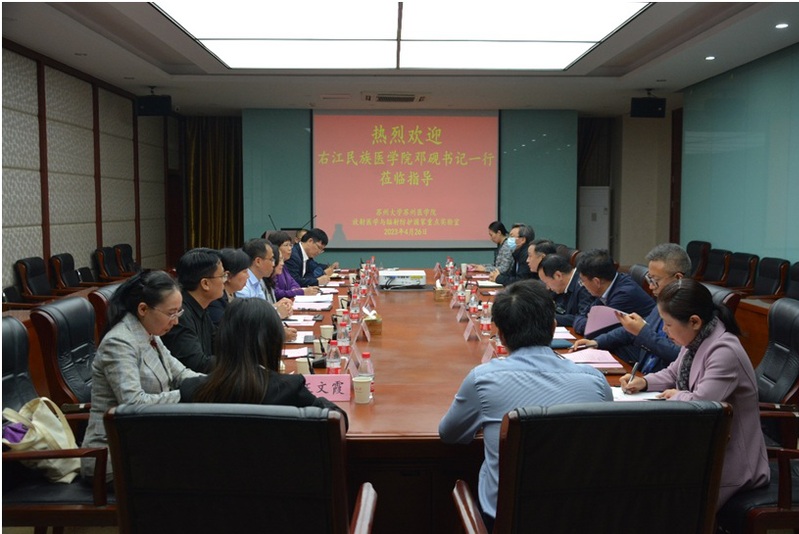 近日,右江民族医学院党委书记邓砚、党委副书记赵丽娟带队院领导班子一行来访苏州医学院,就加强人才培养、学科建设等内容开展交流座谈。苏州医学院党工委书记钱福良、执行院长徐广银等主要领导及各院、办公室主要负责人出席座谈会,会议在医学楼一层放射医学与防护学院会议室举行,由党工委书记钱福良主持。