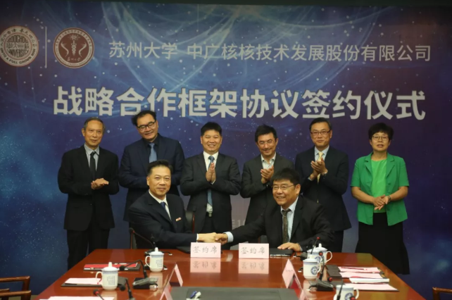 10月8日上午,中广核核技术发展股份有限公司(股票简称:中广核技;股票代码:000881.SZ)与苏州大学在苏州签订战略合作框架协议。根据协议,双方将在加速器应用产业园创建、科技应用平台搭建、人才培养及专业技能培训、核事故医学应急救援中心建设等方面建立长期全面战略合作关系。苏州大学副校长杨一心、中广核技总工程师林乃杰代表双方在协议书上签字。苏州大学校长熊思东,校党委副书记、副校长路建美,中广核技临时党委书记、总经理胡冬明,中广核达胜加速器技术有限公司总经理肖峰见证签约。