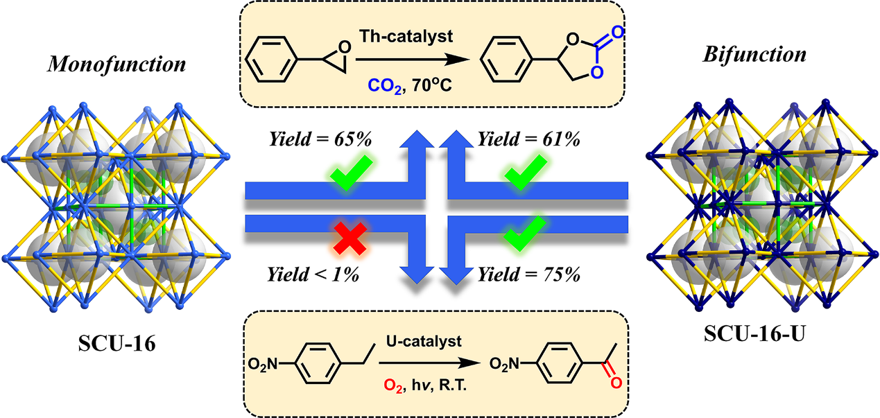 针对这些问题,该课题组报道了一种独特的反应诱导的预组织策略,可以将两个配位模式具有显著差异的锕系离子Th(IV)、U(VI)组装到同一个框架材料中。首先,设计合成了具有目前最大晶胞体积的Th-MOF材料SCU-16(图1)。有趣的是,SCU-16中含有甲酸根包围的空位,该空位可以通过铀酰介导的甲酸-碳酸反应转化为碳酸根修饰的空位(图1f)。反应诱导的碳酸盐空位提供了6个平面配位氧位点,完美匹配铀酰离子的平面六配位构型,最终得到了一种罕见的双锕系金属节点的框架化合物SCU-16-U。通过SC-XRD,IR,XPS,EDS等表征也佐证了铀酰离子的成功配位。该预组织位点是针对U(VI)的特异性识别位点,常见的铜、铅、铁、锌等二价离子在相同条件下均不能配位,即使是同样为平面构型的钒都不能实现该预组装,原因是铀酰不仅仅是作为配位离子还作为催化剂促进了甲酸被氧化。此外,SCU-16-U还表现出基于两种锕系金属离子的多功能催化性质(图2)。一方面,钍离子具有较强的Lewis酸性,配位不饱和的钍金属节点可作为Lewis酸性催化位点;另一方面,铀酰离子具有独特的光催化氧化性能,其氧化电势可达2.6 eV。基于以上两点优势,该课题组以Lewis酸催化的氧化苯乙烯-CO2环化反应与对硝基乙苯的光催化氧化反应为模型反应,探索了SCU-16与SCU-16-U的催化活性。结果表明,SCU-16-U表现出了基于双锕系金属位点的催化活性,其在钍离子介导的CO2固化反应中的催化产率可以达到61%,在铀酰离子介导的对硝基乙苯的氧化反应中的催化产率可以达到75%,而SCU-16仅能催化氧化苯乙烯-CO2环化反应,而无法催化对硝基乙苯的光催化氧化反应。