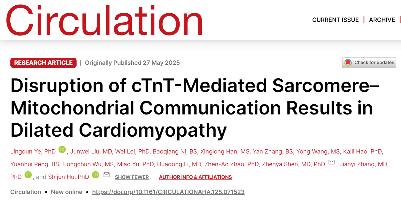 近日,苏州大学放射医学与辐射防护国家重点实验室、苏州大学心血管病研究所/苏州大学附属第一医院胡士军教授和沈振亚教授合作团队在Circulation杂志上发表了题为“The disruption of cTnT-mediated sarcomere-mitochondrial communication results in dilated cardiomyopathy”的研究论文。本研究利用患者特异性诱导多能干细胞(iPSCs)模型,首次绘制出心肌收缩单元与心脏能量代谢枢纽的分子对话图谱,揭示了cTnT突变蛋白通过“肌小节-线粒体通讯”障碍导致DCM的全新病理机制,为开发靶向线粒体稳态治疗策略提供了理论基础。