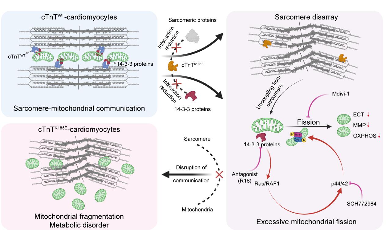 本研究通过全外显子测序,在遗传性DCM家族中筛选出新型致病cTnT突变位点(p.K185E)。为突破传统研究模型的局限,团队利用患者特异iPSCs衍生心肌细胞、自主开发的腔室化血管化心脏类器官(Cell Prolif. 2024;57(8):e13631.)以及点突变转基因小鼠模型,联合分析DCM病理特征,首次发现cTnT(p.K185E)突变不仅破坏心肌细胞内肌小节结构,还可导致线粒体网络片段化和功能紊乱。免疫共沉淀质谱组学显示,cTnT不仅是心肌收缩单元的力学传感器,更是线粒体代谢网络的调控中枢;而cTnT与14-3-3的蛋白相互作用是“肌小节-线粒体对话”的关键分子桥梁。