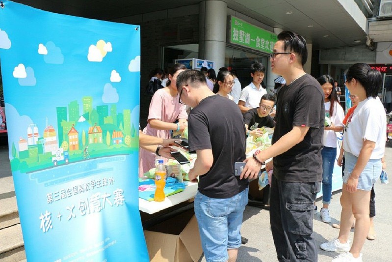 此时,“核+X”创意大赛科普宣传活动正在线下如火如荼地开展。在独墅湖校区一食堂楼下,精心策划好的“快闪”活动的青春与活力,科普海报的醒目展示,引得来往学生纷纷围观,也使他们进一步接触和了解了“核+X”。