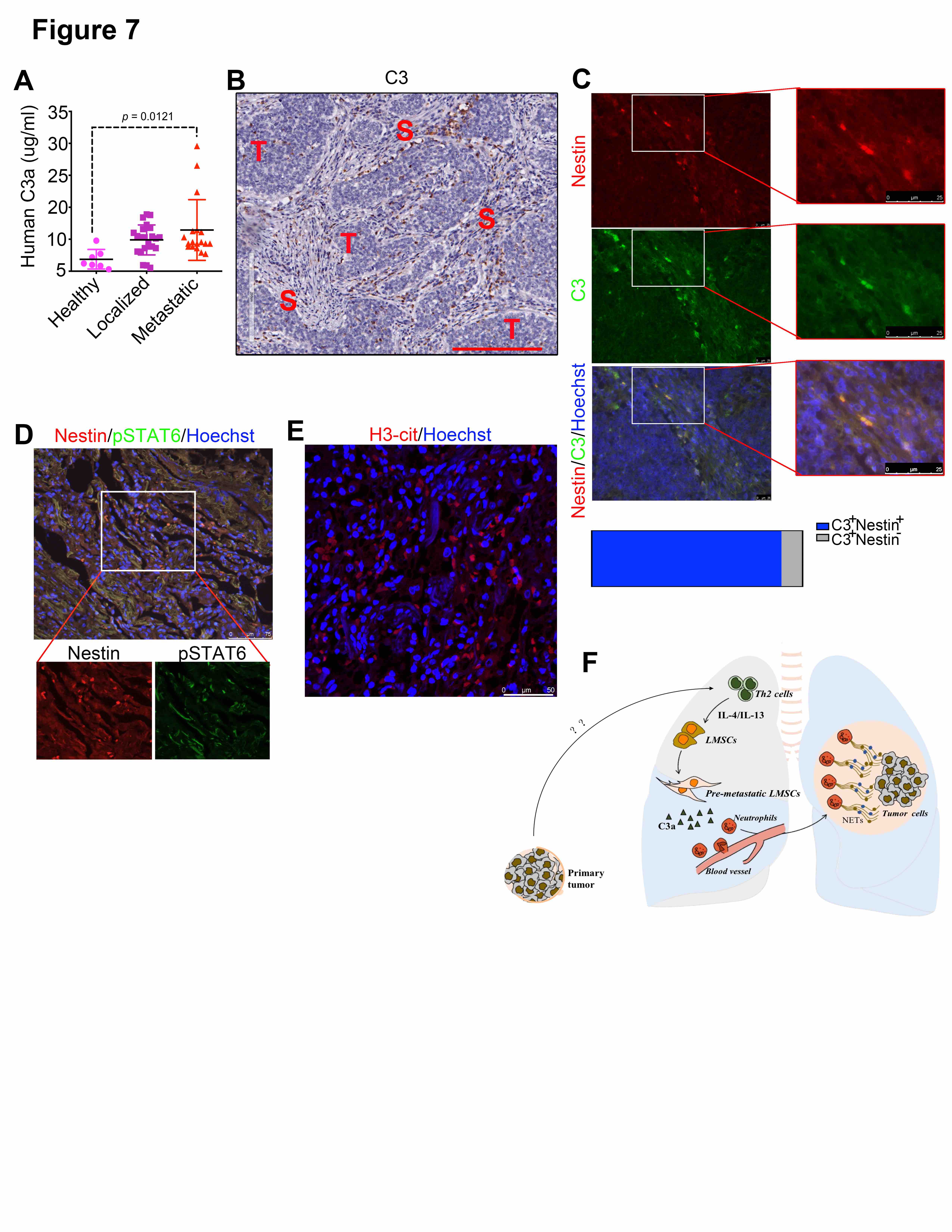 通过比对和分析乳腺癌肺转移动物模型不同病理阶段的肺间充质基质细胞(LMSCs)调控乳腺癌细胞肺部转移和定植的能力,研究发现,乳腺癌肺转移前期和肺转移期小鼠的LMSCs可以显著促进乳腺癌细胞向肺部的转移。RNA-seq分析揭示肺转移前期和肺转移期的LMSCs均高表达补体C3。利用C3缺失MSCs以及C3a受体缺失小鼠,研究揭示LMSCs调控转移灶的形成依赖于其分泌的C3以及其借以C3aR对中性粒细胞的募集。此外,C3能够促进中性粒细胞胞外陷阱(NETs)形成,从而帮助乳腺癌细胞在肺组织中的定植。利用DNA酶破坏NETS形成可以明显消除LMSCs介导的促乳腺癌细胞肺转移的现象。