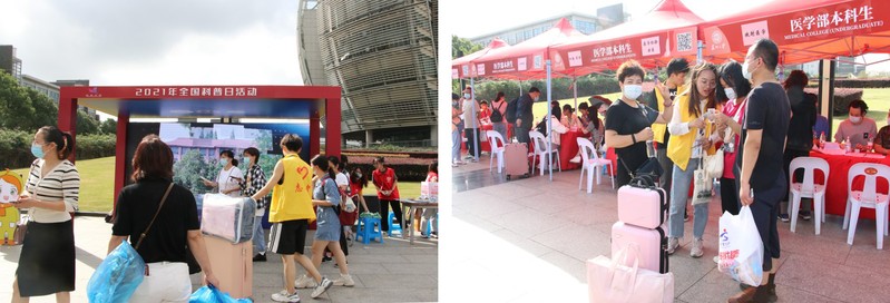 在报到处签到后,身着“黄马甲”的科普协会志愿者们会细心地解答新生和家长的问题,协助他们搬运行李。在国重室科普展示区,老师和同学们依次为新生及家长讲解了辐射在各个领域的应用,如辐照灭菌,辐照育种以及医用辐射防护设备等。让参观者们认识到了辐射在我们的生活中无处不在,但是只要防护得当,辐射就能在大家生活的方方面面起到巨大作用。