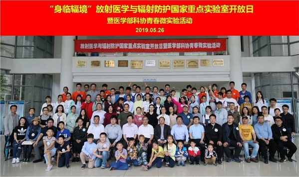 2019年5月26日上午,以“身临辐境”为活动主题,放射医学与辐射防护国家重点实验室公众开放日暨医学部学生科协微实验活动在苏州大学独墅湖校区成功举行。参加本次活动的有苏州市科学技术协会姜颖鹏博士,苏州大学科学技术产业部部长郁秋亚、平台管理科科长施雪奎,医学部放射医学与防护学院党委书记曹建平、副院长许玉杰、国家杰出青年科学家代表王殳凹教授、青年千人史海斌教授、放射医学与辐射防护国家重点实验室综合办公室徐加英主任,放射医学与防护学院教工第一党支部书记朱巍以及组织本次活动的青年教师和学生志愿者。本次活动邀请到近百位社会公众,他们分别来自于江苏省科技厅、南京市法院、福建省集美大学、南京医科大学、苏州大学、苏州科技大学、苏州工艺美术职业技术学院、翰林小学、星洋学校、景城学校、带城实验小学、莲花学校等。
