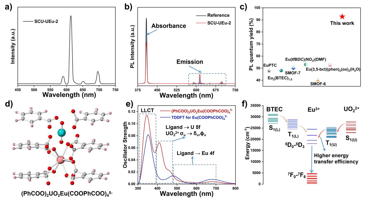 图2. a) SCU-UEu-2的荧光光谱;b) SCU-UEu-2的量子产率;c) 已报道的EuMOF与SCU-UEu-2的量子产率对比;d) 计算模型(PhCOO)2UO2Eu(COOPhCOO)45-;e) TDDFT/PBE0对(PhCOO)2UO2Eu(COOPhCOO)45-和Eu(COOPhCOO)45-计算结果;f) SO-CASSCF/NEVPT2计算对于配合物Eu(COOPhCOO)45-以及(PhCOO)2UO2Eu(COOPhCOO)45-能级位置计算。