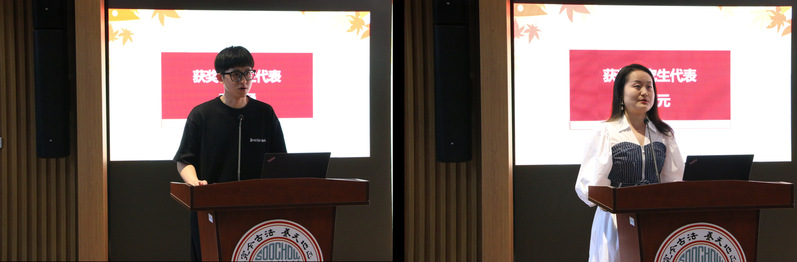 2019级本科生周纾涵、2022级博士研究生薛惠元两位同学作为获奖学生代表发言。他们表达了对学院各位老师和企业领导的感谢,表示获得该荣誉是对自己的肯定、激励与鼓舞。回顾过往,辛勤付出习得的知识显得格外珍贵;展望未来,科研之路仍应重任在肩,应时时自省、突破创新、砥砺前行、踏实奋进以取得更加优异的成绩。