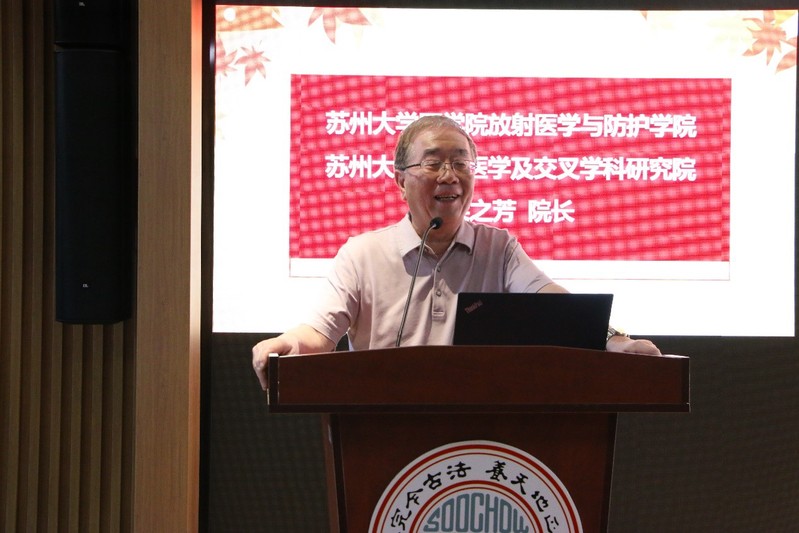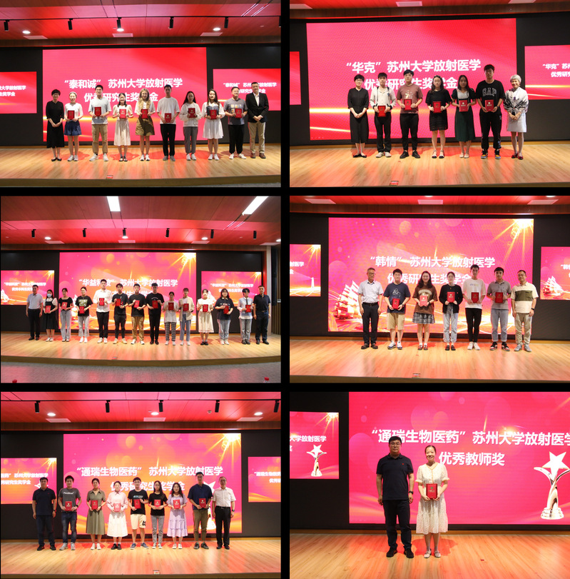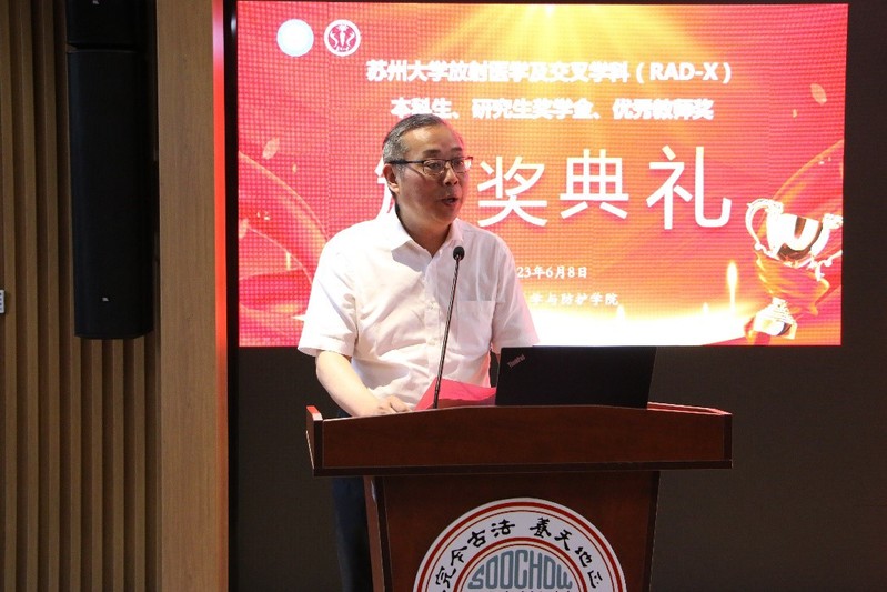 2023年6月8日下午,苏州大学放射医学及交叉学科(RAD-X)本科生、研究生奖学金、优秀教师奖颁奖典礼于独墅湖校区四楼学术报告厅成功举行。研究生院副院长徐维英、学生工作部副部长潘爱华、苏州医学院党工委书记钱福良、党工委副书记孟玲玲、学生工作办公室主任温洪波、美中嘉和集团副总裁贾汀、人力资源总部人事经理叶杨、华克医疗科技股份公司总经理刘爱娣、华益科技有限公司副总经理周业松、韩情生物科技有限公司对外联络部部长张国新、通瑞生物医药公司质量研究总监刘进鹏出席此次颁奖典礼,放射医学与防护学院院长柴之芳院士、常务副院长曹建平、副院长周光明和学院师生代表共同参加典礼。颁奖典礼由曹建平教授主持。