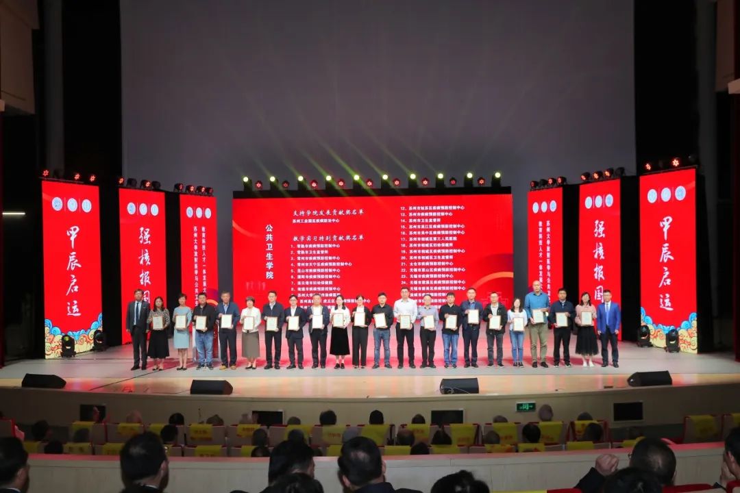 苏州医学院党工委书记钱福良、放射医学与防护学院副院长周光明,为放射医学与防护学院实践实习和教学实习单位颁发了特别贡献奖;苏州医学院执行院长李斌、公共卫生学院党委书记芮秀文,颁发支持公共卫生学院发展贡献奖和教学实习特别贡献奖。