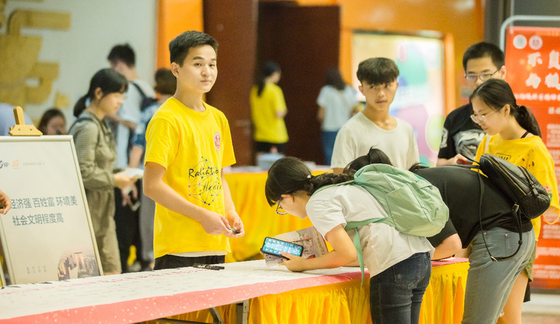 报告会开始前,在青年教师和学生志愿者的指引下,参会人员依次领取了核科学科普宣传资料并在纪念卷轴上签名留念,并有序入场。