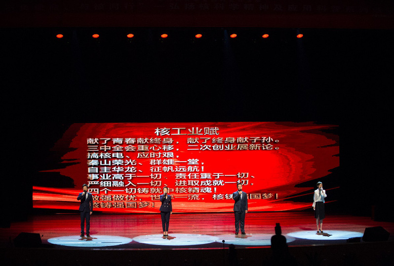宣讲会共分为“英明决策发展原子能事业”、“艰苦创业‘两弹一艇’惊天地”、“两弹元勋以身许国”、“不忘初心核铸强国梦”四个篇章。讲述者通过讲解、朗诵、分角色演讲的方式,结合视频、照片、场景再现等手段,为观众们再次展现了中国核工业发展历程。讲述了以邓稼先、钱三强、郭永怀为代表的我国老一辈革命家和科学家,克服巨大困难、战胜艰难险阻、完成艰巨任务的真实事迹,以一幕幕场景、一首首歌曲朗诵、一个个感人故事,加深了人们对“两弹一星”精神和核工业精神的理解。从711矿到404厂,再到202厂,一个个简单的编号见证着我国核工业艰难而伟大的崛起,当身着一袭深蓝中山装,神情肃穆的话剧演员们大声呼喊着“安下心、扎下根、戈壁滩上献青春”的核工业创业口号,有的观众眼里闪着激动的泪光。随着宣讲会的落幕,观众们还沉浸在对钱三强、王淦昌、郭永怀、于敏等科学家们的敬佩中,和对我国核工业崛起的无比赞叹。