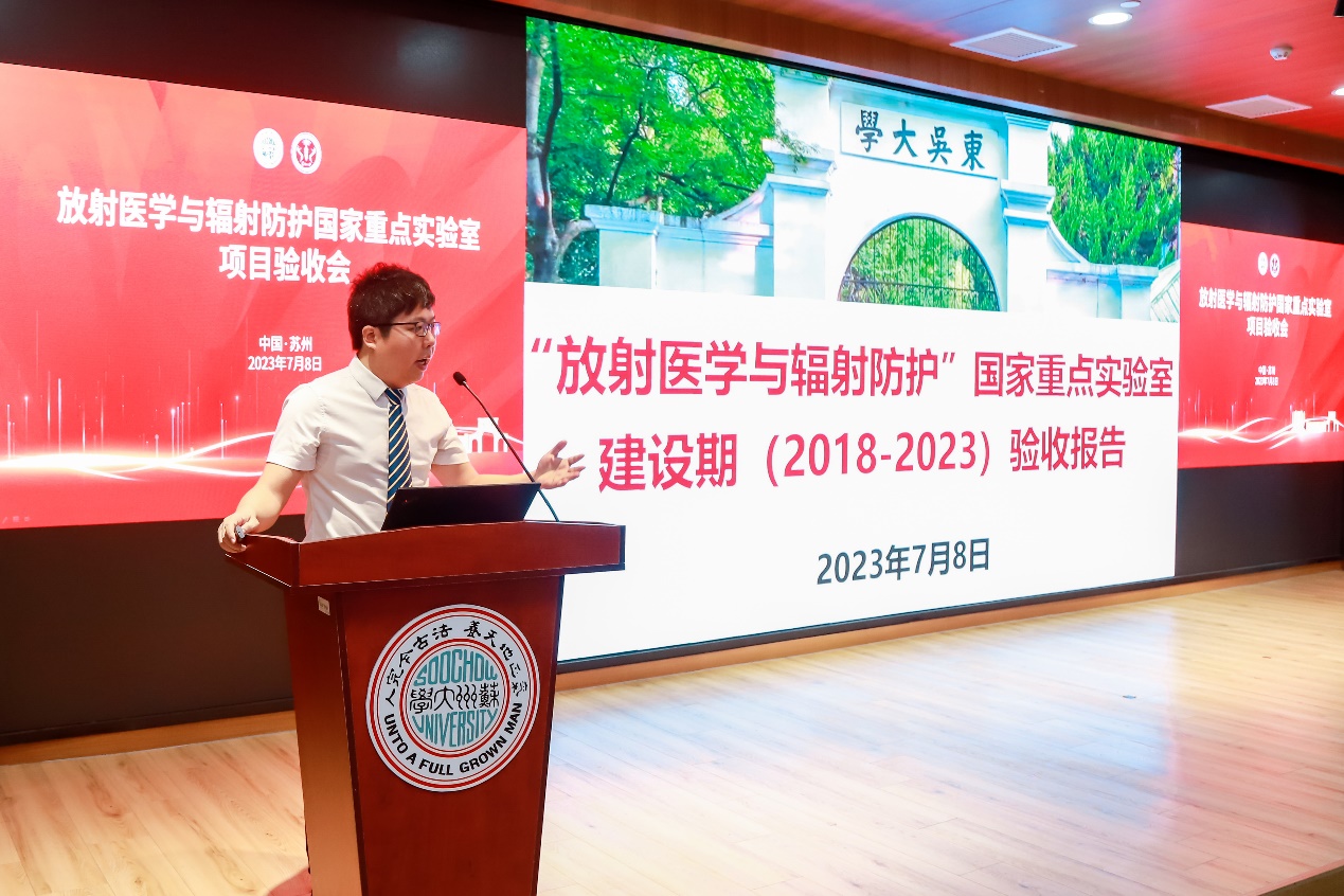 7月8日上午,省部共建放射医学与辐射防护国家重点实验室验收会在苏州大学独墅湖校区医学楼四楼学术报告厅举行。江苏省科技厅科研机构处副处长张洪钢,苏州市副市长张桥,苏州工业园区科创委科技管理处处长邹和成,军事科学院军事医学研究院辐射医学研究所所长刘曙晨、研究所科技委主任周平坤,中广核研究院首席专家、院总工卢向晖,项目依托单位苏州大学党委副书记、校长张晓宏,校党委常委、副校长李孝峰及校各职能部门负责人,苏州医学院院长詹启敏院士、执行院长徐广银,苏州大学附属第二医院副院长钱志远等出席会议。国家重点实验室名誉主任、学院院长柴之芳院士,国家重点实验室负责人和室务会成员、专家、全体师生等参加会议。会议由李孝峰主持。