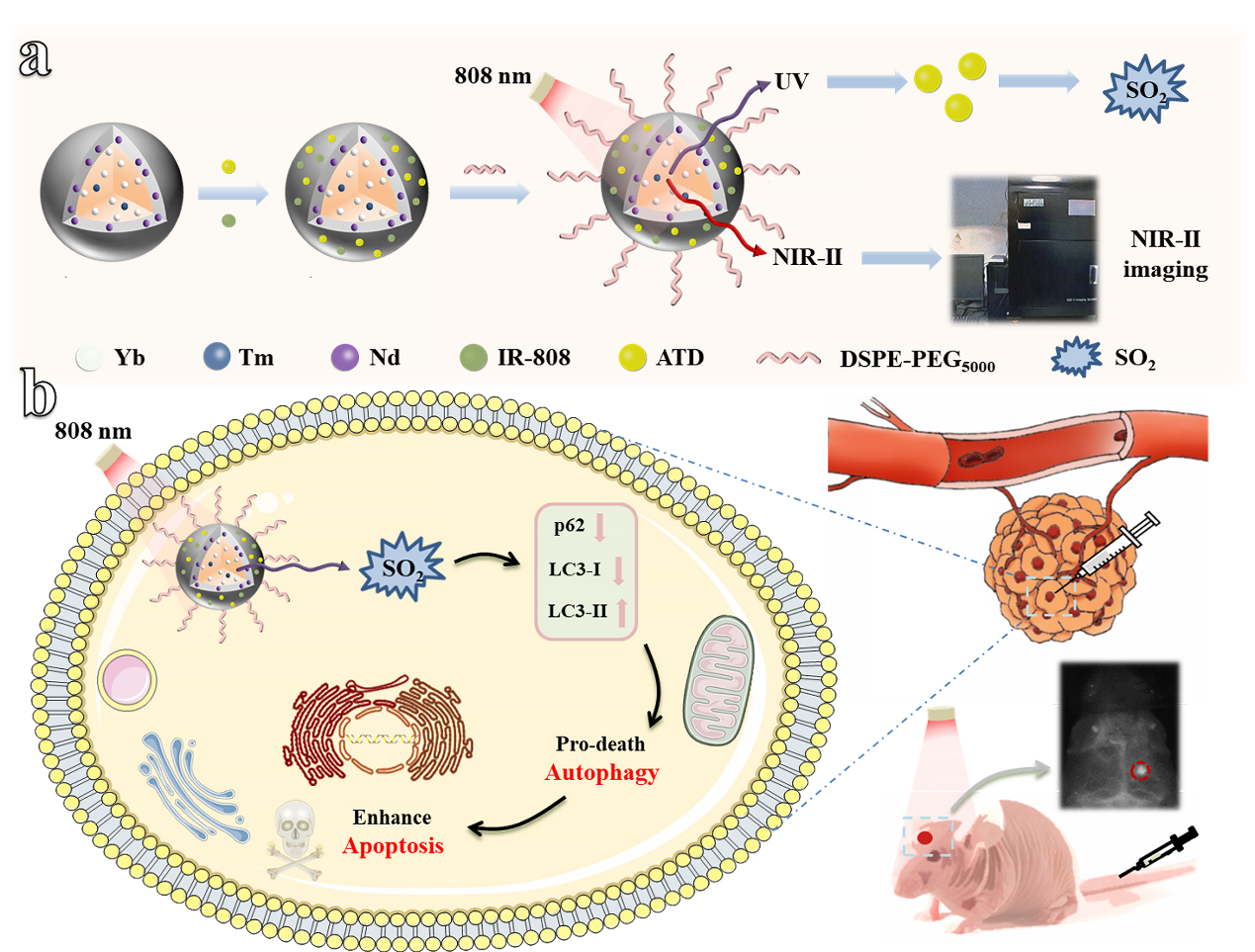 在前期工作中,分子影像与核医学研究中心团队基于稀土纳米颗粒构筑了一系列多功能纳米探针,发现了纳米探针光热转化以及荧光转化的尺寸依赖性和入射波长依赖性,实现了肿瘤及血管的多模式(NIR-II、MRI、CT)成像(Biomaterials, 2018, 175, 30-43;Bioconjugate Chem., 2020, 31, 340-351;Sci. Bull., 2021,https://doi.org/10.1016/j.scib.2021.11.008)。此外,利用近红外染料IR-808敏化稀土纳米颗粒,实现了下转换NIR II荧光的显著增强,并用于原位胶质母细胞瘤的NIR II荧光成像和成像引导下的手术切除(Biomaterials, 2019, 219, 119364;Nano Today 2020, 34, 100905)。在上述工作基础之上,研究团队首先构建了同时具有上转换和下转换发射的NaYF4:Yb/Tm@NaYF4:Nd核壳纳米颗粒,并在其表面修饰了SO2气体前药分子ATD和NIR-II有机染料分子IR-808。研究结果表明,染料敏化可以同时增强稀土纳米颗粒的上/下转换发光。在808 nm的近红外光激发下,纳米颗粒的上转换发光增强了28倍,能够有效激活ATD分子以实现SO2气体的按需释放,其下转换发光增强了5倍,可用于原位脑胶质瘤的NIR-II荧光成像。研究团队进一步探究了光响应释放的SO2气体对肿瘤的杀伤机制,结果表明SO2气体通过下调p62蛋白表达,上调LC3-II/LC3-I比值,诱导肿瘤细胞促凋亡自噬,最终抑制肿瘤的生长。总之,本研究展示了稀土纳米颗粒在肿瘤成像和光控治疗中的潜力。