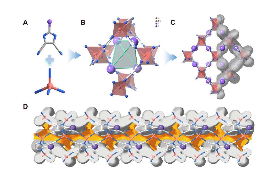 本研究基于“多重原子限域增强效应”设计理念,以金属有机框架材料为设计平台,以平面配位的梯形重原子碘代配体(碘原子为“头部”)和四面体配位的Cu+为金属节点(CuN4结构单元)自组装形成三维金属有机框架材料(Cu(idc-I))。单晶X射线衍射(SCXRD)结构解析显示梯形配体沿c轴头对尾排列,并在三维框架中交错取向,使在Cu(idc-I)中成功构筑全新的串联排列的纳米四面体碘笼。该四面体碘笼沿a轴的空腔尺寸约4.1 Å,与Xe(4.047 Å)和Kr(3.655 Å)的动力学直径高度匹配,可精确容纳单个惰性气体原子(图2)。