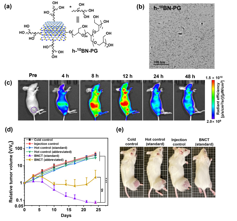 图1. (a) 纳米硼药h-10BN-PG的化学结构;(b) h-10BN-PG的透射电镜照片;(c) 荷瘤裸鼠注射h-10BN-PG-Cy7前后的体内荧光成像,圆圈所示为CT26肿瘤;(d) BNCT治疗后各组小鼠肿瘤生长曲线;(e) BNCT治疗24天后各组小鼠照片。