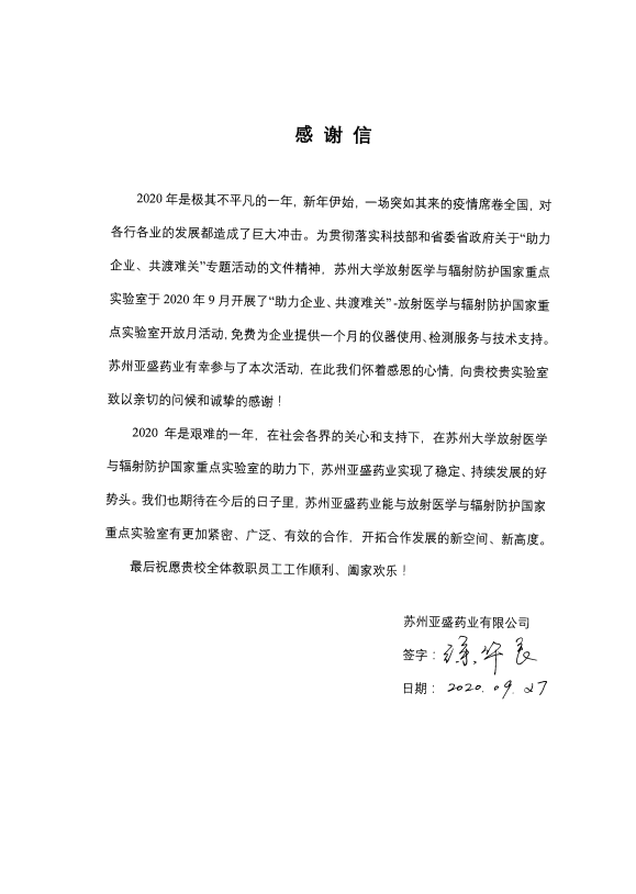 最后,王晖研究员表示感谢国重室“助力企业、共渡难关”开放月活动提供免费的检测和咨询服务,不仅解决了他们因疫情耽误的检测工作,同时获得了纳米药物研发相关的智慧支持,为他们解答了一些技术难题,切切实实为他们减轻了负担。9月27日,亚盛药业新药研发部门负责人徐华良总监发来感谢信,感谢放射医学与辐射国家重点实验室提供的帮助,为亚盛药业解决了很多实际困难,助力公司可持续发展,期待未来能够与国重室有更加紧密、广泛的合作。