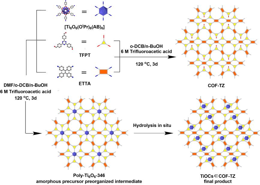 图1. 预组装策略合成孔道限域钛氧簇光催化材料TiOCs∈COF-TZ示意图