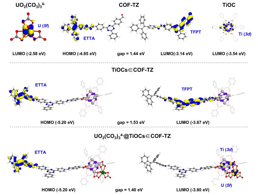 图3. UO2(CO3)34-、COF-TZ、 TiOCs、TiOCs∈COF-TZ以及UO2(CO3)34-@TiOCs∈COF-TZ的几何优化和分子轨道模拟