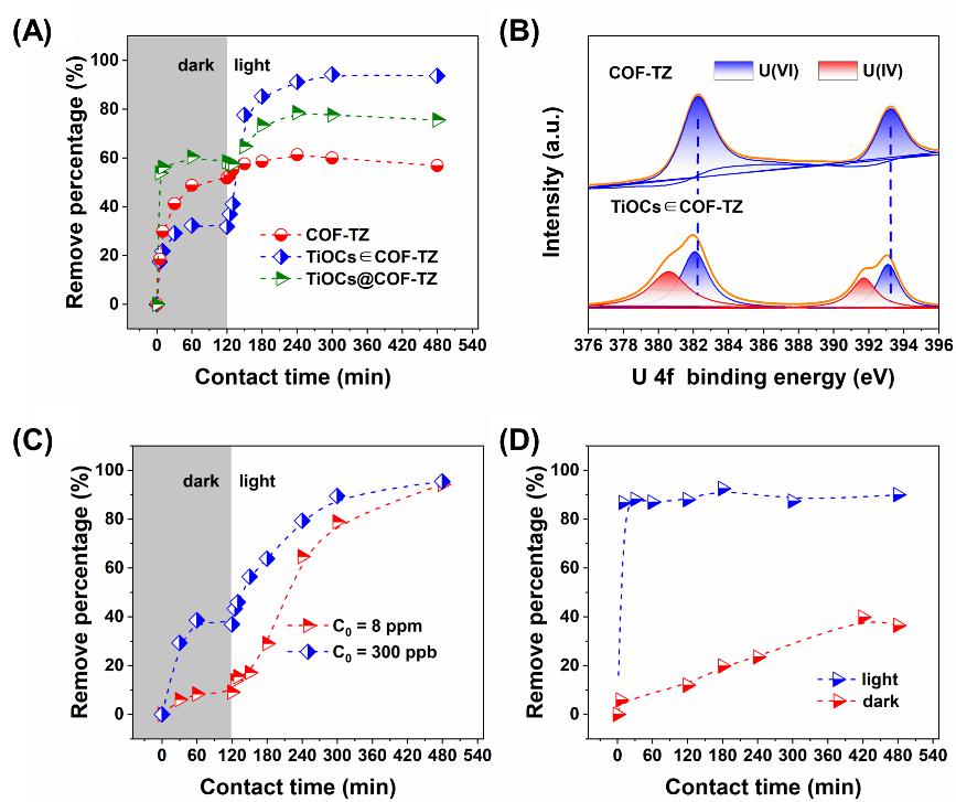 图2.光催化还原UO2(CO3)34-性能研究: A) COF-TZ、TiOCs∈COF-TZ以及TiOCs@COF-TZ光催化还原UO2(CO3)34-动力学曲线 (C0 = 8 ppm);B) 还原产物中铀的价态鉴定;C) 加标海水中光催化还原UO2(CO3)34-动力学曲线;D) 真实海水中TiOCs∈COF-TZ光照、黑暗条件下UO2(CO3)34-提取动力学曲线