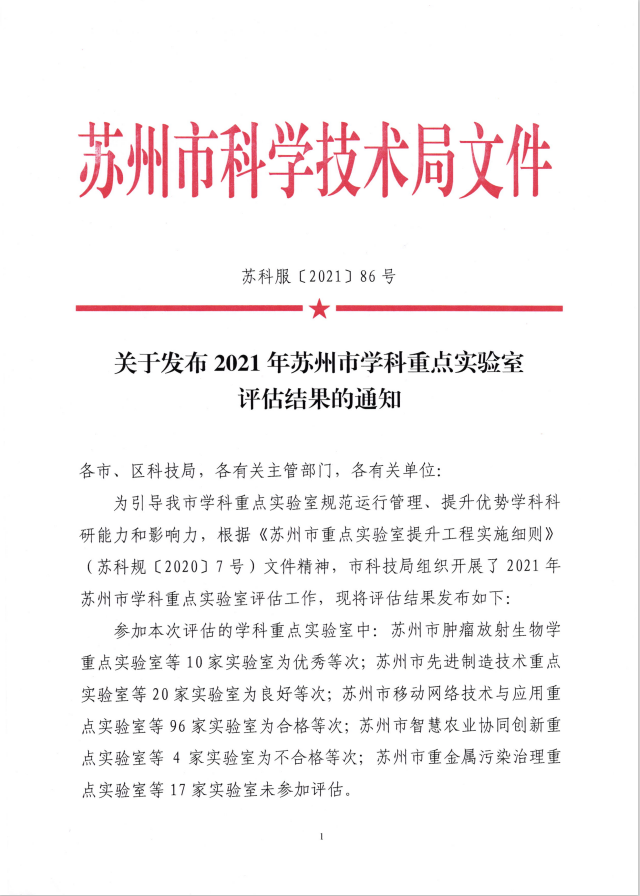 12月9日,苏州市科学技术局发布了《关于发布2021年苏州市学科重点实验室评估结果的通知》(苏科服〔2021〕86号),我院的苏州市肿瘤放射生物学重点实验室获评“优秀”。