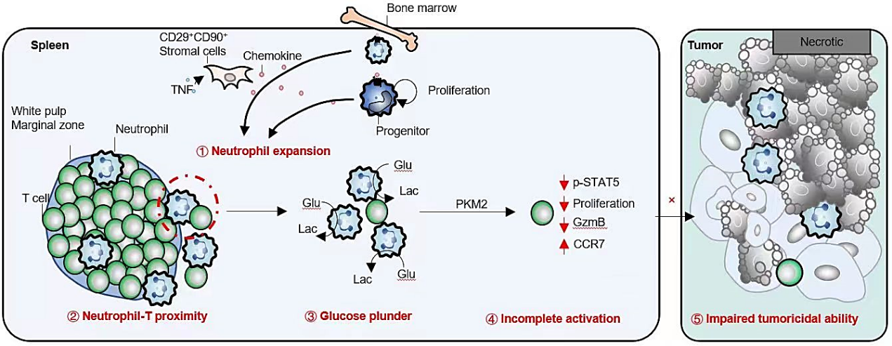 图注:乳腺癌病理进程中,脾脏嗜中性粒细胞的聚集通过剥夺葡萄糖,借以PKM2-STAT5通路削弱T细胞抗肿瘤免疫应答