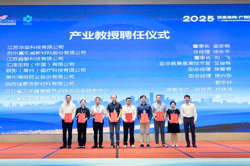 活动现场,江苏高校放射医学协同创新中心与常州市肿瘤医院、中核核素医疗投资有限公司、江苏超敏科技有限公司、江苏华益科技有限公司四家单位完成共建签约。聘任10位相关行业专家为协同创新中心产业教授,张桥为产业教授颁发聘书。
