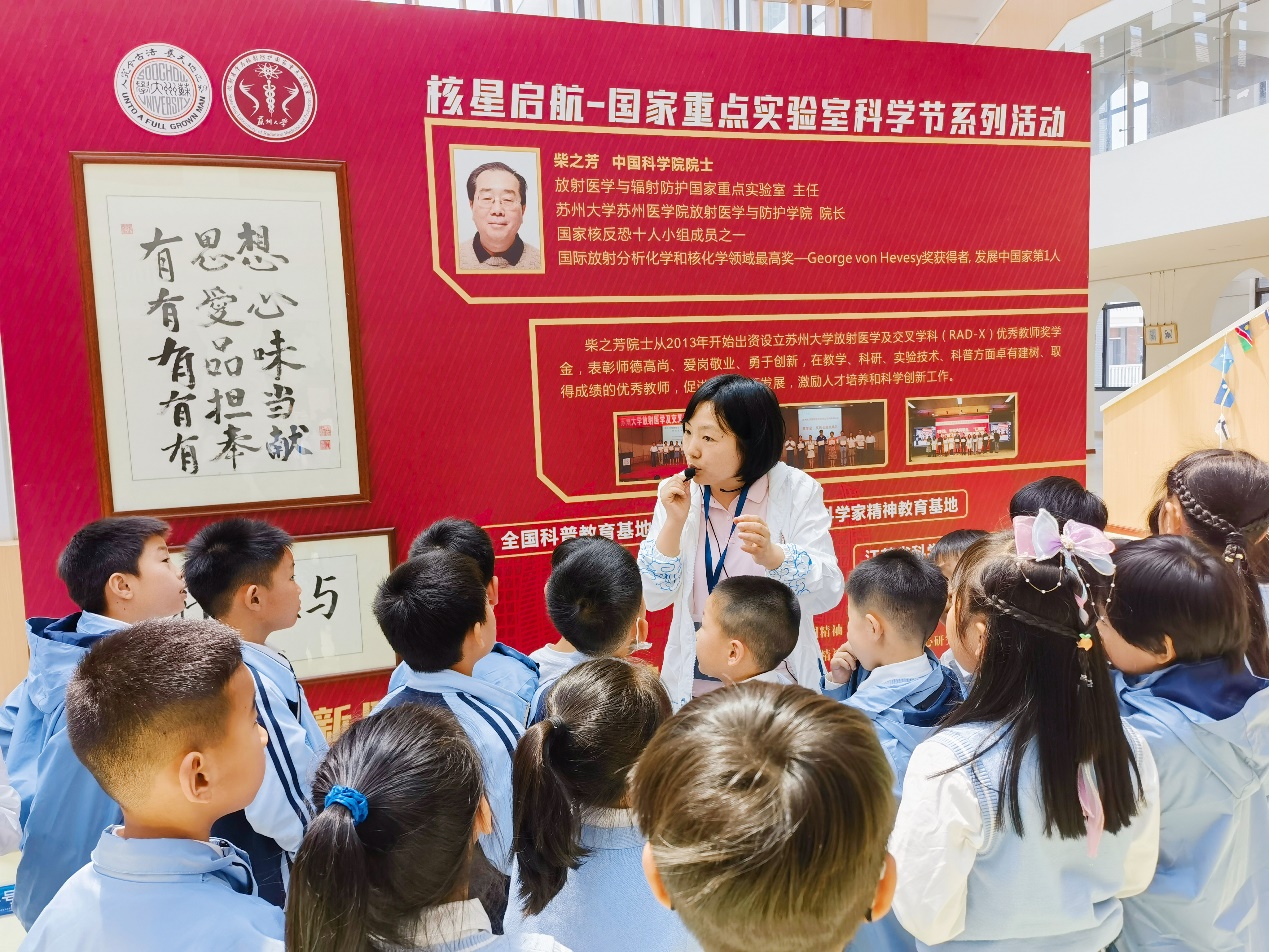 2023年5月8日上午,“核星启航”——国家重点实验室科学节系列活动走进苏州市工业园区朝前路实验学校正式开幕。朝前路实验学校校长张锴、副校长沈琴芳;苏州大学苏州医学院放射医学与防护学院副院长、国际宇航科学院院士周光明,国重室综合办主任徐加英、科普骨干教师赵琳、马晓川、聂晶等,以及朝前路实验学校近1500名师生参加本场活动,活动由沈琴芳主持。活动得到张家港市德仁科教仪器设备有限公司、山东数字人科技股份有限公司协力支持。